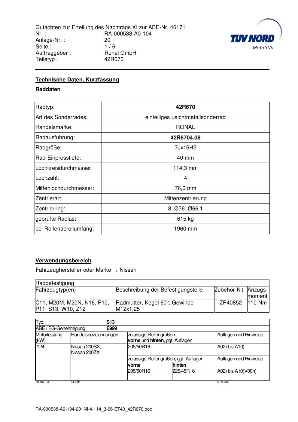 Dieses Gutachten (abe) bezieht sich auf die Alufelge Ronal 42R670 in der Ausführung 7Jx16 ET 0, Mittenloch 0 mm (KBA 46171). Im PDF findest du typischerweise zulässige Reifengrößen, Auflagen/Anbauhinweise und – je nach Dokument – Hinweise zur Eintragung.