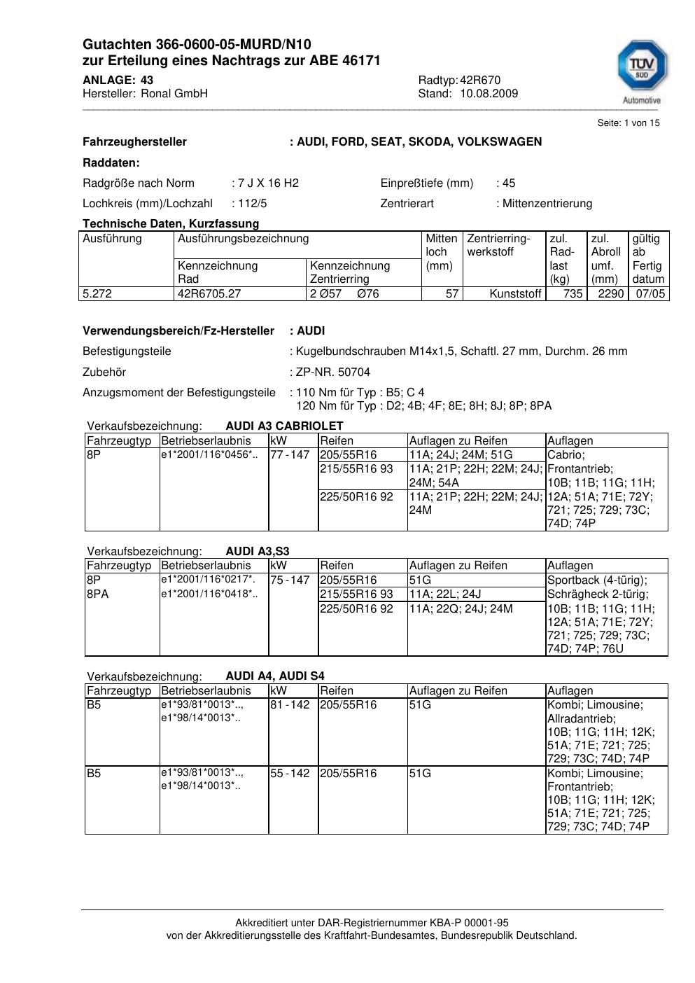 Dieses Gutachten (abe) bezieht sich auf die Alufelge Ronal 42R670 in der Ausführung 7Jx16 ET 0, Mittenloch 0 mm (KBA 46171). Im PDF findest du typischerweise zulässige Reifengrößen, Auflagen/Anbauhinweise und – je nach Dokument – Hinweise zur Eintragung.