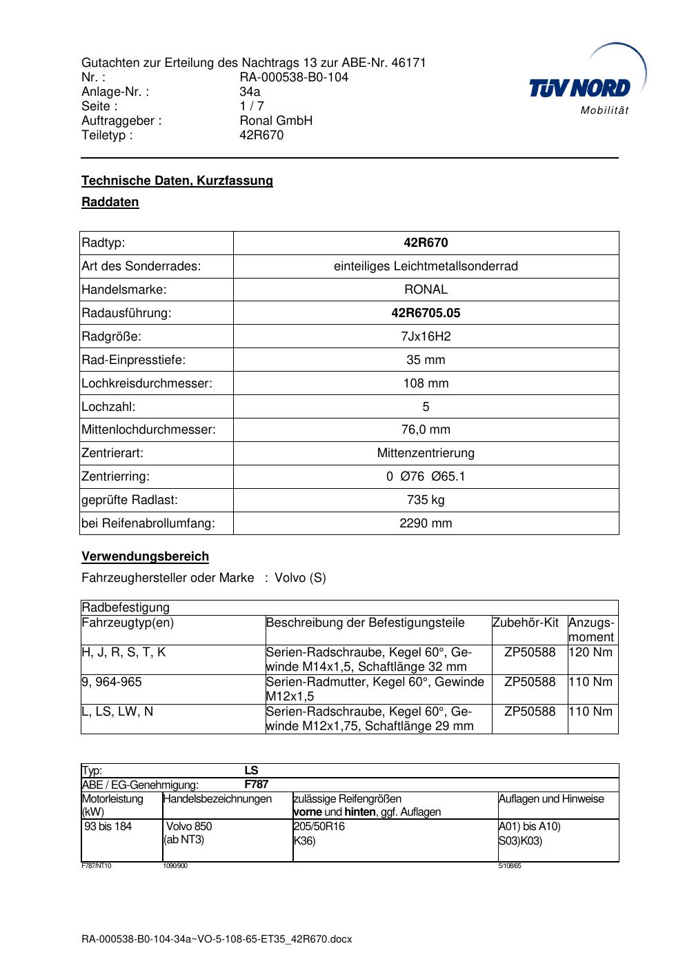 Dieses Gutachten (abe) bezieht sich auf die Alufelge Ronal 42R670 in der Ausführung 7Jx16 ET 0, Mittenloch 0 mm (KBA 46171). Im PDF findest du typischerweise zulässige Reifengrößen, Auflagen/Anbauhinweise und – je nach Dokument – Hinweise zur Eintragung.