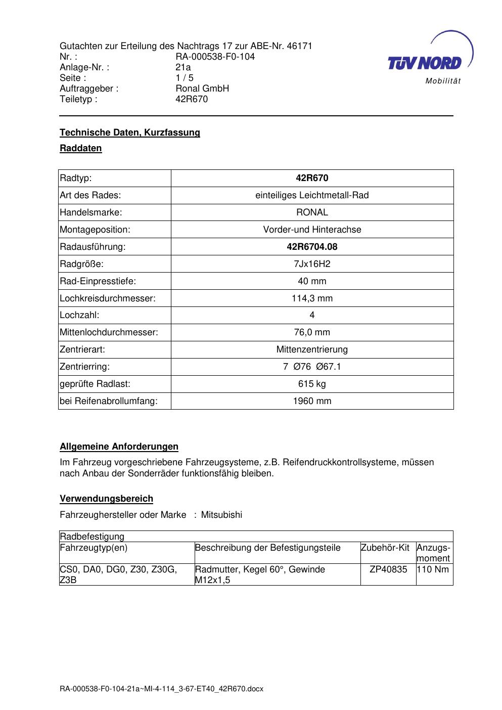 Dieses Gutachten (abe) bezieht sich auf die Alufelge Ronal 42R670 in der Ausführung 7Jx16 ET 0, Mittenloch 0 mm (KBA 46171). Im PDF findest du typischerweise zulässige Reifengrößen, Auflagen/Anbauhinweise und – je nach Dokument – Hinweise zur Eintragung.