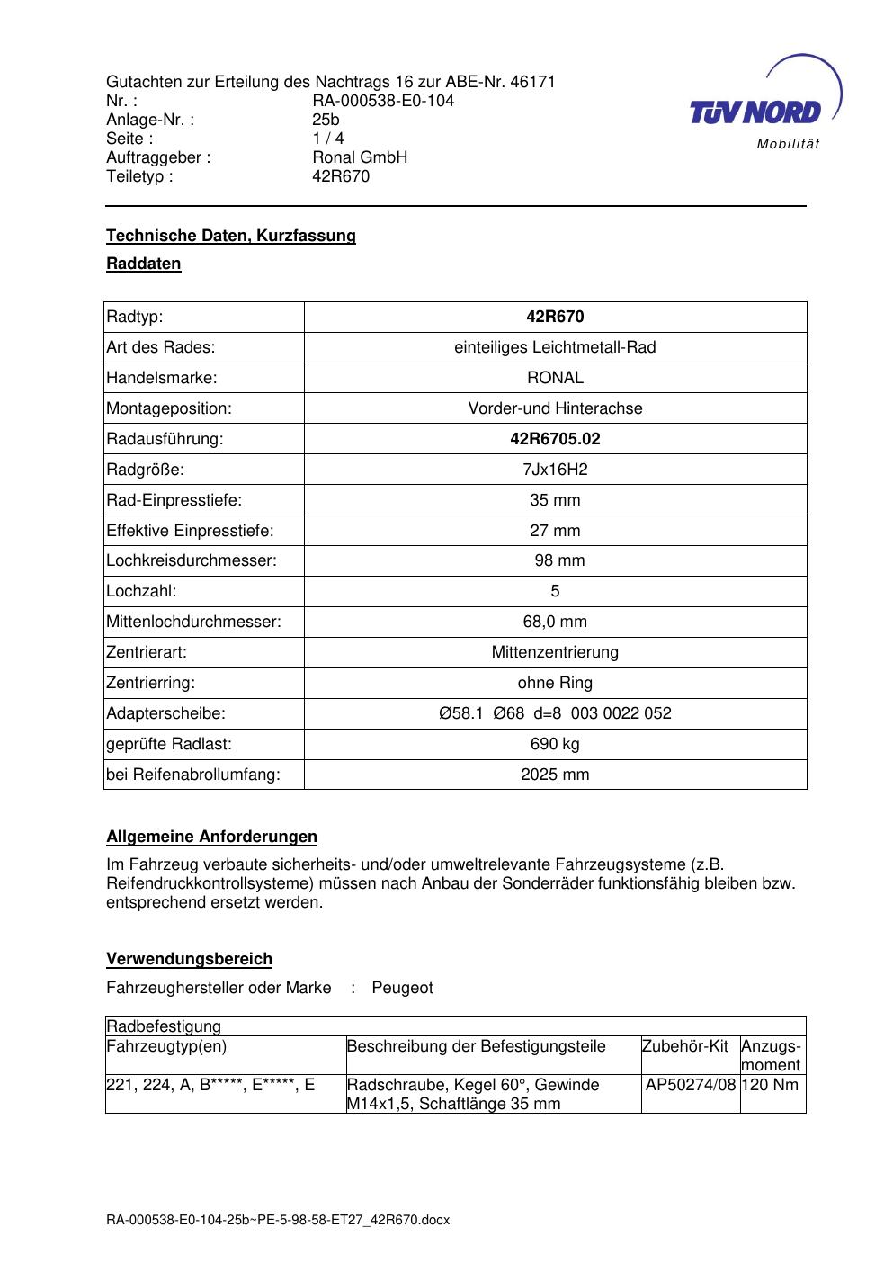 Dieses Gutachten (abe) bezieht sich auf die Alufelge Ronal 42R670 in der Ausführung 7Jx16 ET 0, Mittenloch 0 mm (KBA 46171). Im PDF findest du typischerweise zulässige Reifengrößen, Auflagen/Anbauhinweise und – je nach Dokument – Hinweise zur Eintragung.