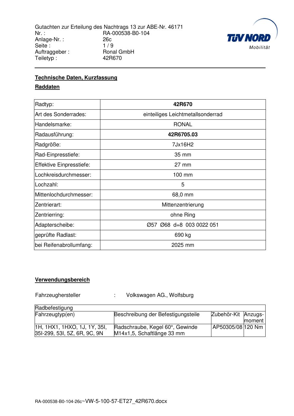 Dieses Gutachten (abe) bezieht sich auf die Alufelge Ronal 42R670 in der Ausführung 7Jx16 ET 0, Mittenloch 0 mm (KBA 46171). Im PDF findest du typischerweise zulässige Reifengrößen, Auflagen/Anbauhinweise und – je nach Dokument – Hinweise zur Eintragung.