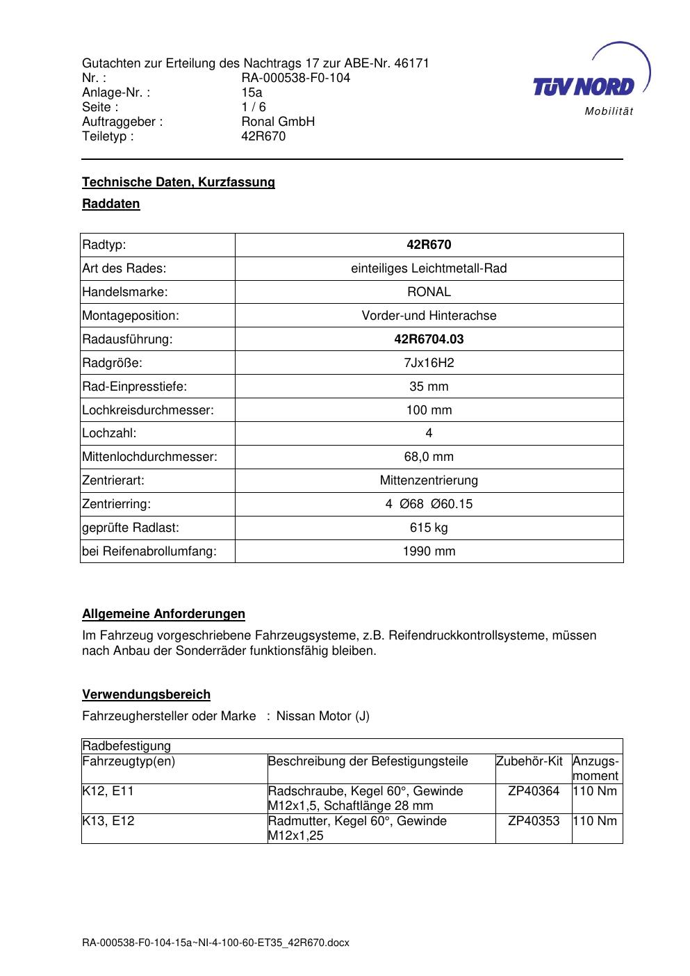Dieses Gutachten (abe) bezieht sich auf die Alufelge Ronal 42R670 in der Ausführung 7Jx16 ET 0, Mittenloch 0 mm (KBA 46171). Im PDF findest du typischerweise zulässige Reifengrößen, Auflagen/Anbauhinweise und – je nach Dokument – Hinweise zur Eintragung.
