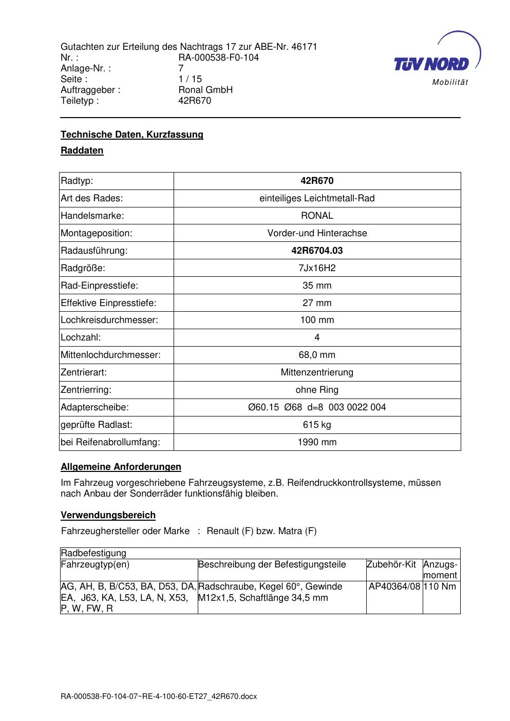 Dieses Gutachten (abe) bezieht sich auf die Alufelge Ronal 42R670 in der Ausführung 7Jx16 ET 0, Mittenloch 0 mm (KBA 46171). Im PDF findest du typischerweise zulässige Reifengrößen, Auflagen/Anbauhinweise und – je nach Dokument – Hinweise zur Eintragung.