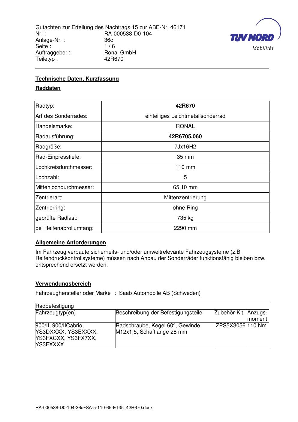 Dieses Gutachten (abe) bezieht sich auf die Alufelge Ronal 42R670 in der Ausführung 7Jx16 ET 0, Mittenloch 0 mm (KBA 46171). Im PDF findest du typischerweise zulässige Reifengrößen, Auflagen/Anbauhinweise und – je nach Dokument – Hinweise zur Eintragung.
