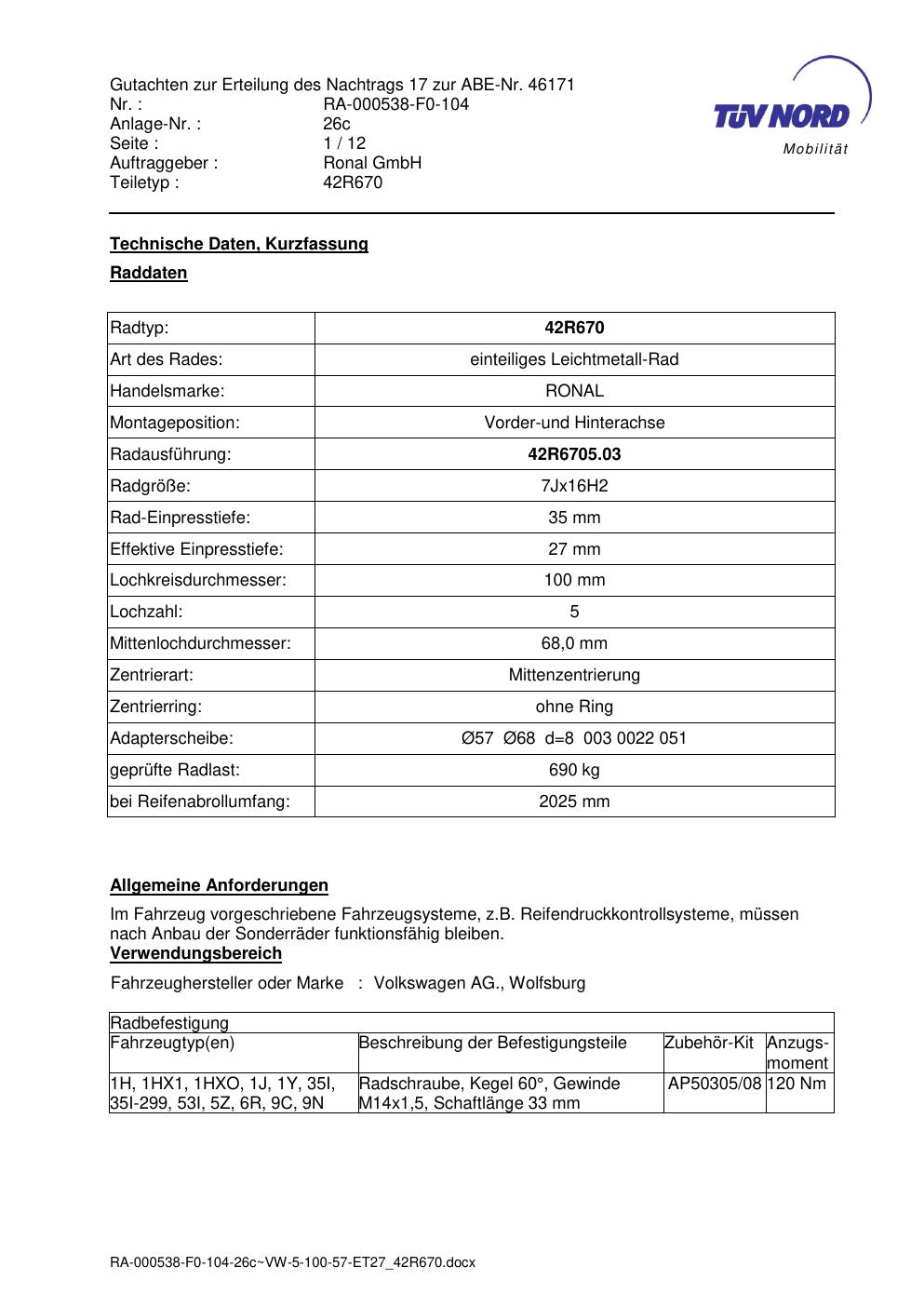 Dieses Gutachten (abe) bezieht sich auf die Alufelge Ronal 42R670 in der Ausführung 7Jx16 ET 0, Mittenloch 0 mm (KBA 46171). Im PDF findest du typischerweise zulässige Reifengrößen, Auflagen/Anbauhinweise und – je nach Dokument – Hinweise zur Eintragung.