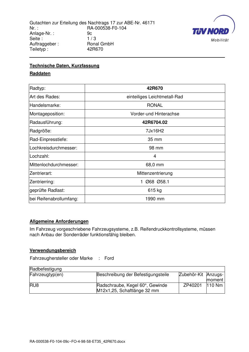Dieses Gutachten (abe) bezieht sich auf die Alufelge Ronal 42R670 in der Ausführung 7Jx16 ET 0, Mittenloch 0 mm (KBA 46171). Im PDF findest du typischerweise zulässige Reifengrößen, Auflagen/Anbauhinweise und – je nach Dokument – Hinweise zur Eintragung.