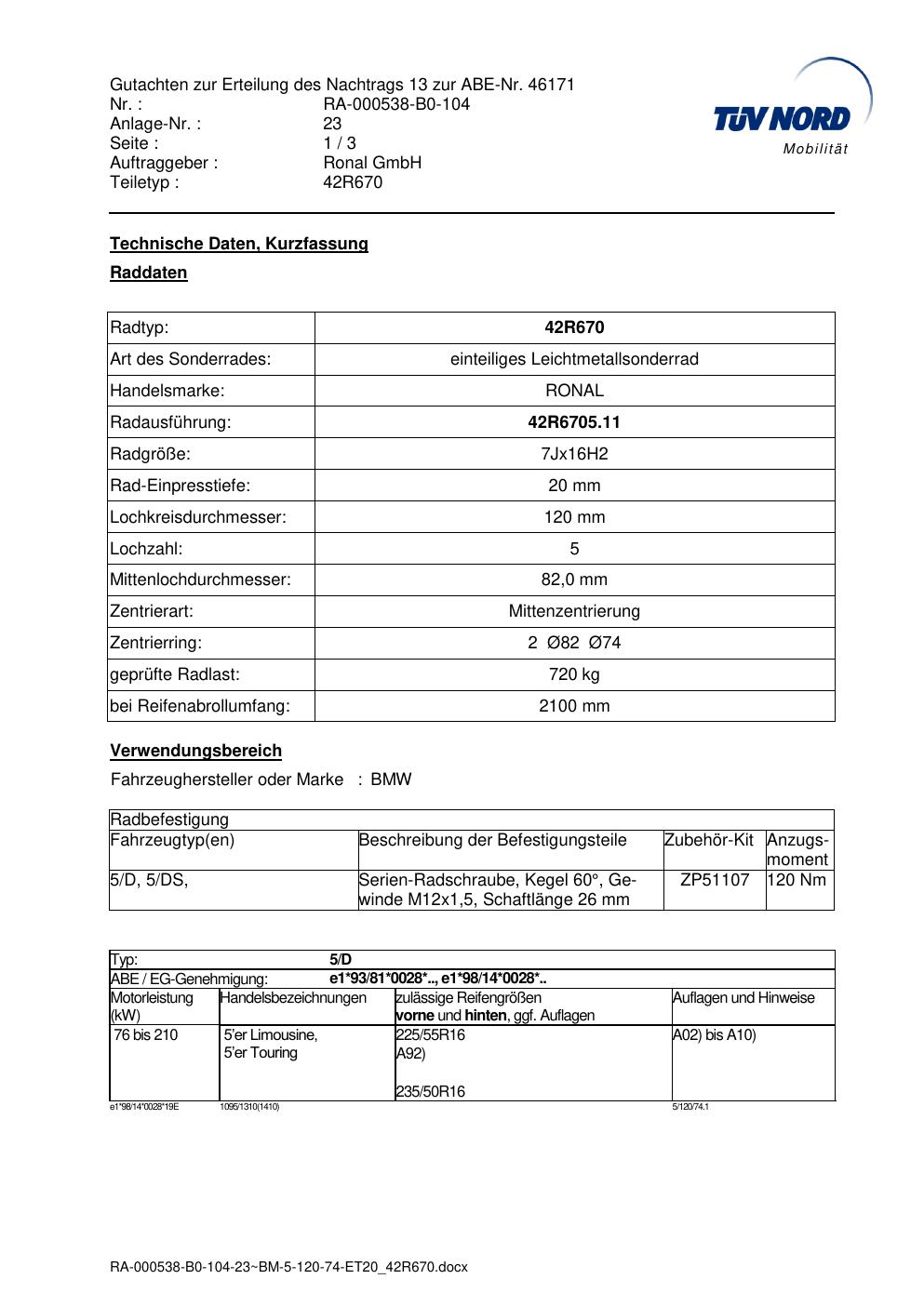 Dieses Gutachten (abe) bezieht sich auf die Alufelge Ronal 42R670 in der Ausführung 7Jx16 ET 0, Mittenloch 0 mm (KBA 46171). Im PDF findest du typischerweise zulässige Reifengrößen, Auflagen/Anbauhinweise und – je nach Dokument – Hinweise zur Eintragung.