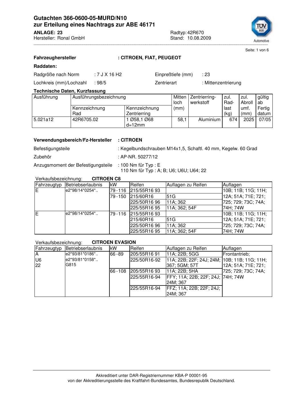 Dieses Gutachten (abe) bezieht sich auf die Alufelge Ronal 42R670 in der Ausführung 7Jx16 ET 0, Mittenloch 0 mm (KBA 46171). Im PDF findest du typischerweise zulässige Reifengrößen, Auflagen/Anbauhinweise und – je nach Dokument – Hinweise zur Eintragung.