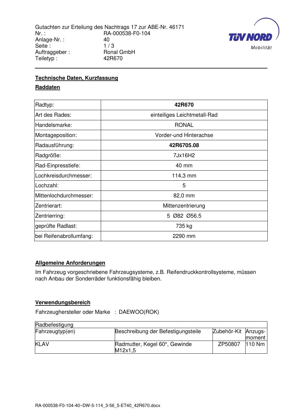 Dieses Gutachten (abe) bezieht sich auf die Alufelge Ronal 42R670 in der Ausführung 7Jx16 ET 0, Mittenloch 0 mm (KBA 46171). Im PDF findest du typischerweise zulässige Reifengrößen, Auflagen/Anbauhinweise und – je nach Dokument – Hinweise zur Eintragung.