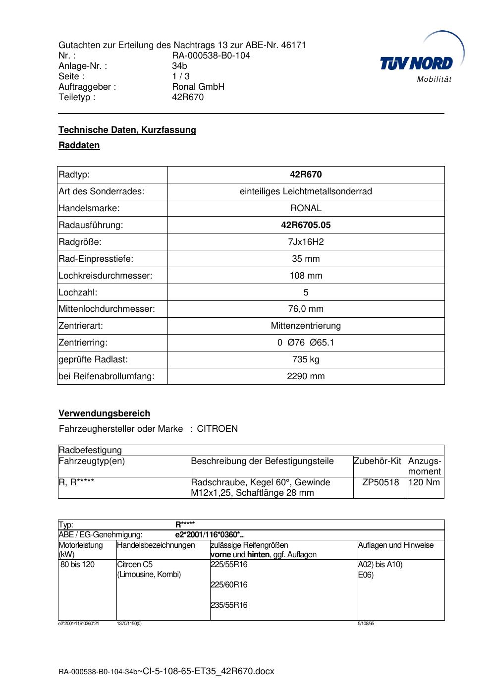 Dieses Gutachten (abe) bezieht sich auf die Alufelge Ronal 42R670 in der Ausführung 7Jx16 ET 0, Mittenloch 0 mm (KBA 46171). Im PDF findest du typischerweise zulässige Reifengrößen, Auflagen/Anbauhinweise und – je nach Dokument – Hinweise zur Eintragung.