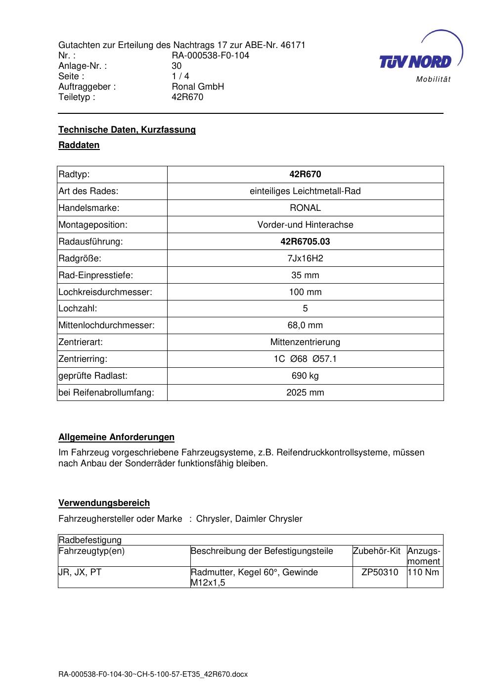 Dieses Gutachten (abe) bezieht sich auf die Alufelge Ronal 42R670 in der Ausführung 7Jx16 ET 0, Mittenloch 0 mm (KBA 46171). Im PDF findest du typischerweise zulässige Reifengrößen, Auflagen/Anbauhinweise und – je nach Dokument – Hinweise zur Eintragung.