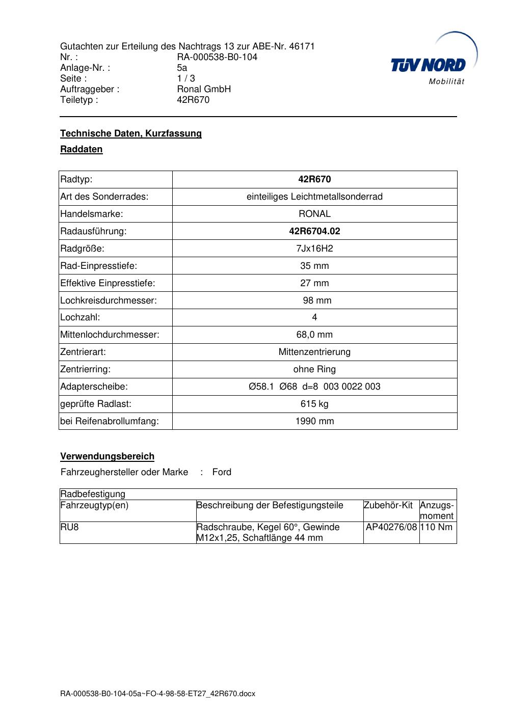 Dieses Gutachten (abe) bezieht sich auf die Alufelge Ronal 42R670 in der Ausführung 7Jx16 ET 0, Mittenloch 0 mm (KBA 46171). Im PDF findest du typischerweise zulässige Reifengrößen, Auflagen/Anbauhinweise und – je nach Dokument – Hinweise zur Eintragung.