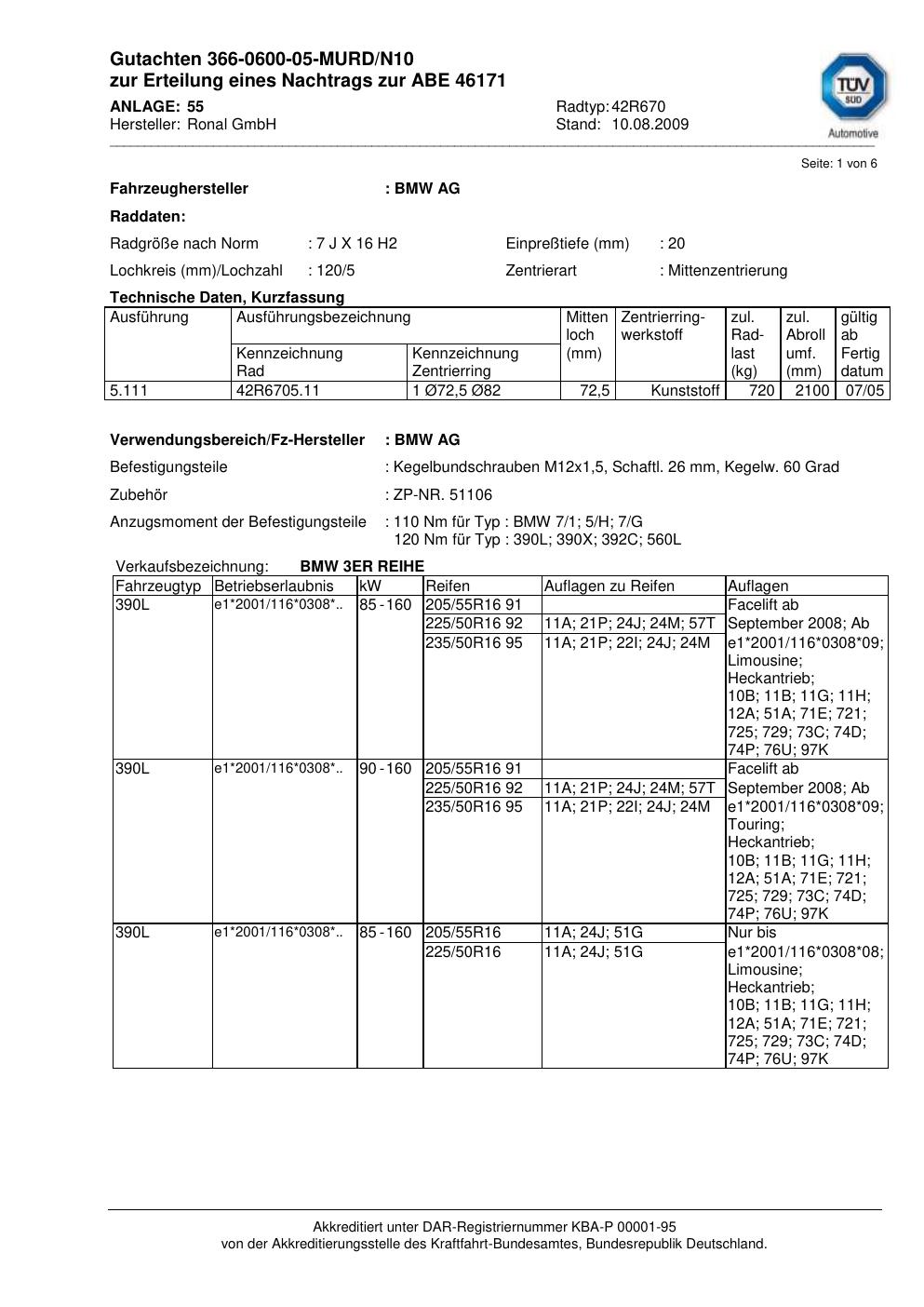 Dieses Gutachten (abe) bezieht sich auf die Alufelge Ronal 42R670 in der Ausführung 7Jx16 ET 0, Mittenloch 0 mm (KBA 46171). Im PDF findest du typischerweise zulässige Reifengrößen, Auflagen/Anbauhinweise und – je nach Dokument – Hinweise zur Eintragung.
