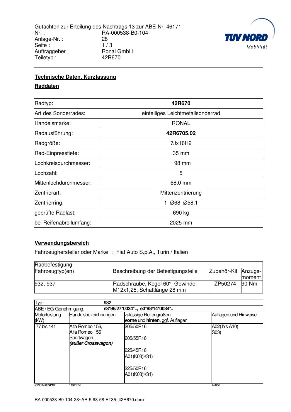 Dieses Gutachten (abe) bezieht sich auf die Alufelge Ronal 42R670 in der Ausführung 7Jx16 ET 0, Mittenloch 0 mm (KBA 46171). Im PDF findest du typischerweise zulässige Reifengrößen, Auflagen/Anbauhinweise und – je nach Dokument – Hinweise zur Eintragung.