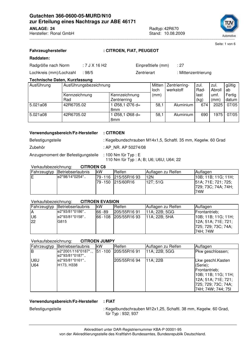 Dieses Gutachten (abe) bezieht sich auf die Alufelge Ronal 42R670 in der Ausführung 7Jx16 ET 0, Mittenloch 0 mm (KBA 46171). Im PDF findest du typischerweise zulässige Reifengrößen, Auflagen/Anbauhinweise und – je nach Dokument – Hinweise zur Eintragung.