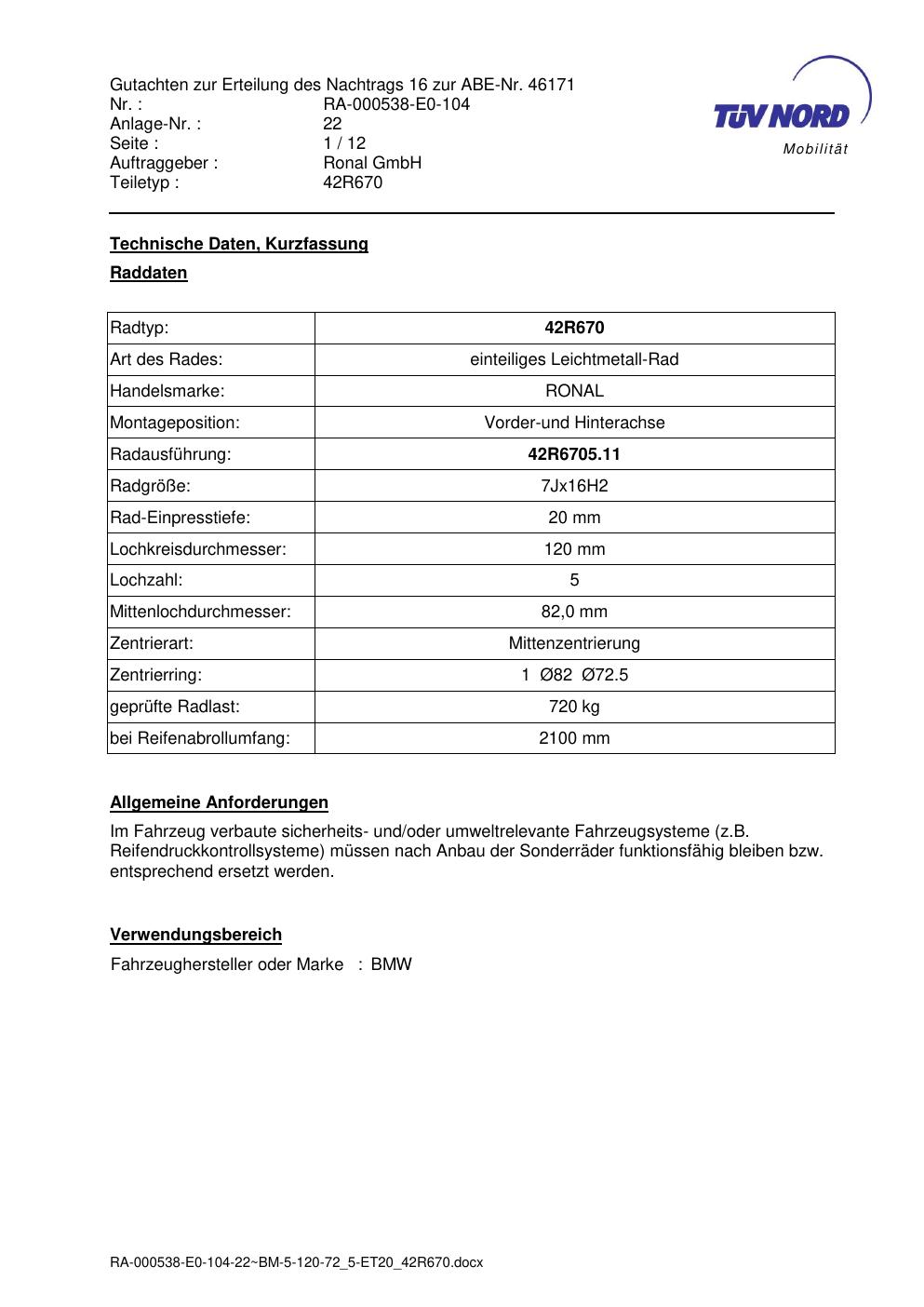 Dieses Gutachten (abe) bezieht sich auf die Alufelge Ronal 42R670 in der Ausführung 7Jx16 ET 0, Mittenloch 0 mm (KBA 46171). Im PDF findest du typischerweise zulässige Reifengrößen, Auflagen/Anbauhinweise und – je nach Dokument – Hinweise zur Eintragung.