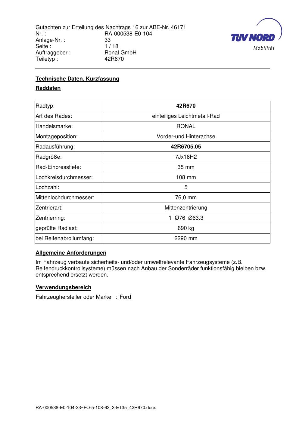 Dieses Gutachten (abe) bezieht sich auf die Alufelge Ronal 42R670 in der Ausführung 7Jx16 ET 0, Mittenloch 0 mm (KBA 46171). Im PDF findest du typischerweise zulässige Reifengrößen, Auflagen/Anbauhinweise und – je nach Dokument – Hinweise zur Eintragung.