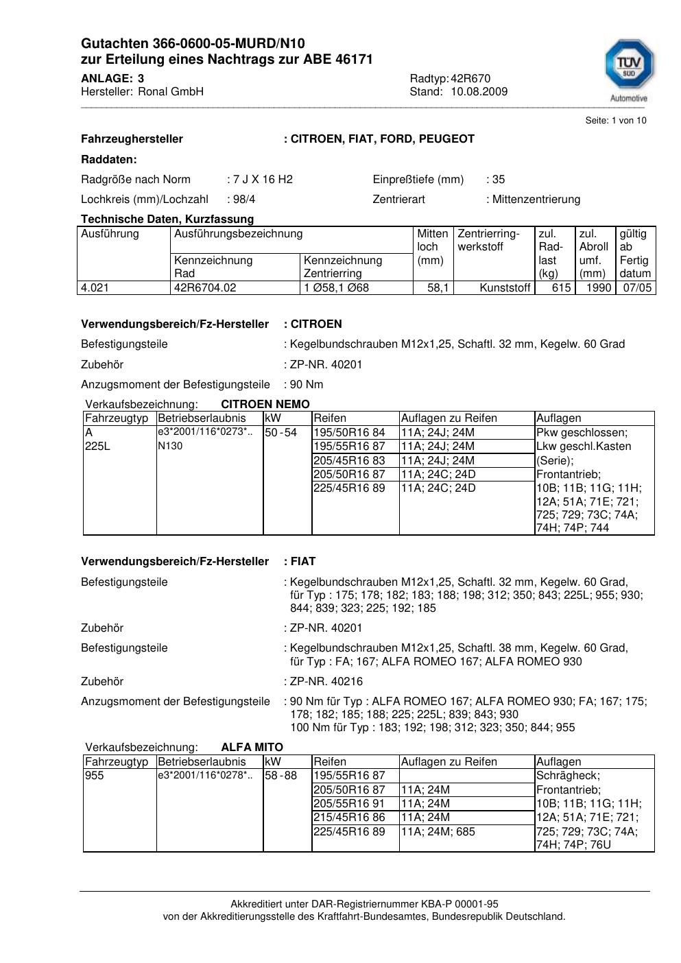 Dieses Gutachten (abe) bezieht sich auf die Alufelge Ronal 42R670 in der Ausführung 7Jx16 ET 0, Mittenloch 0 mm (KBA 46171). Im PDF findest du typischerweise zulässige Reifengrößen, Auflagen/Anbauhinweise und – je nach Dokument – Hinweise zur Eintragung.