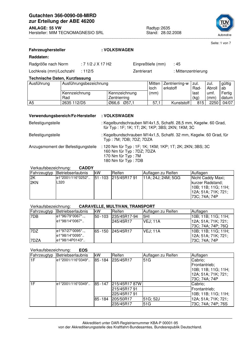 Felgengutachten / abe für Alufelgen ATS 2635 (2Jx17 ET 0, Mittenloch 0 mm) mit KBA 46200 (Zertifikatsnummer 46200). Hier kostenlos als PDF herunterladen. Der Download-Link ist 24 Stunden gültig und kann bis zu zwei Mal verwendet werden.