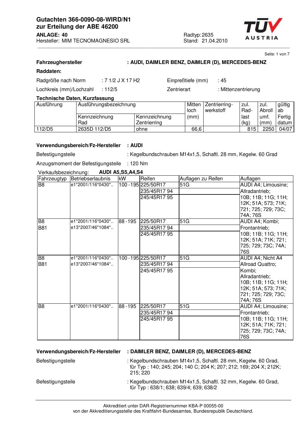 Felgengutachten / abe für Alufelgen ATS 2635 (2Jx17 ET 0, Mittenloch 0 mm) mit KBA 46200 (Zertifikatsnummer 46200). Hier kostenlos als PDF herunterladen. Der Download-Link ist 24 Stunden gültig und kann bis zu zwei Mal verwendet werden.