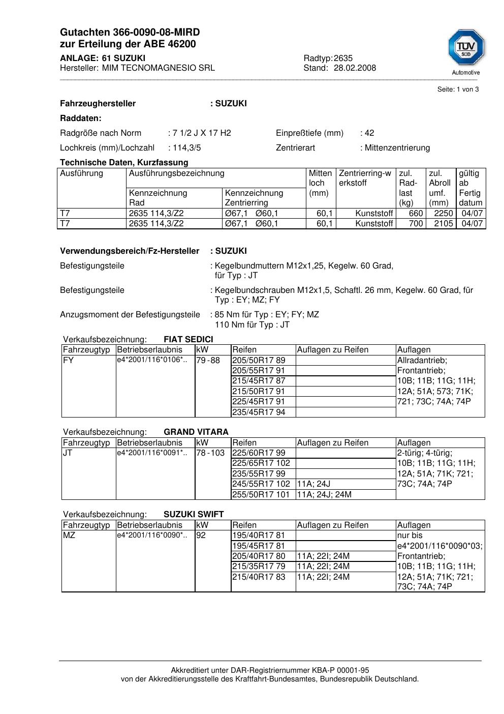 Felgengutachten / abe für Alufelgen ATS 2635 (2Jx17 ET 0, Mittenloch 0 mm) mit KBA 46200 (Zertifikatsnummer 46200). Hier kostenlos als PDF herunterladen. Der Download-Link ist 24 Stunden gültig und kann bis zu zwei Mal verwendet werden.