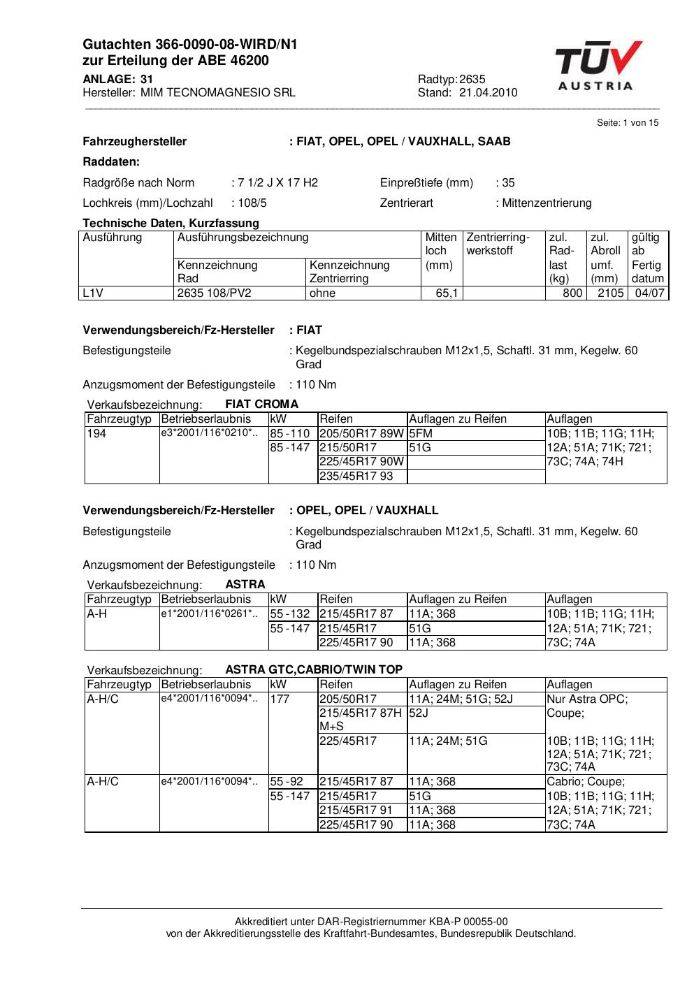 Felgengutachten / abe für Alufelgen ATS 2635 (2Jx17 ET 0, Mittenloch 0 mm) mit KBA 46200 (Zertifikatsnummer 46200). Hier kostenlos als PDF herunterladen. Der Download-Link ist 24 Stunden gültig und kann bis zu zwei Mal verwendet werden.