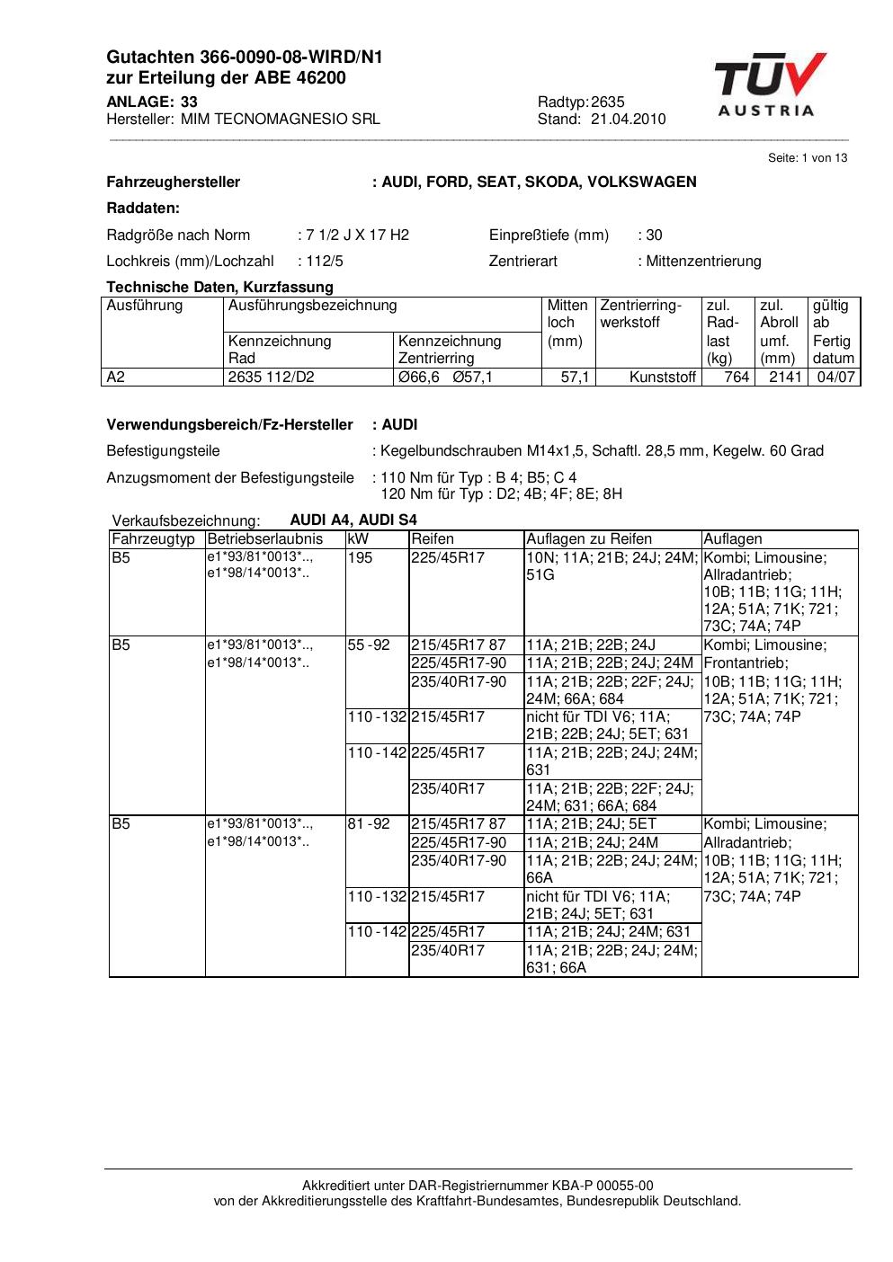 Felgengutachten / abe für Alufelgen ATS 2635 (2Jx17 ET 0, Mittenloch 0 mm) mit KBA 46200 (Zertifikatsnummer 46200). Hier kostenlos als PDF herunterladen. Der Download-Link ist 24 Stunden gültig und kann bis zu zwei Mal verwendet werden.