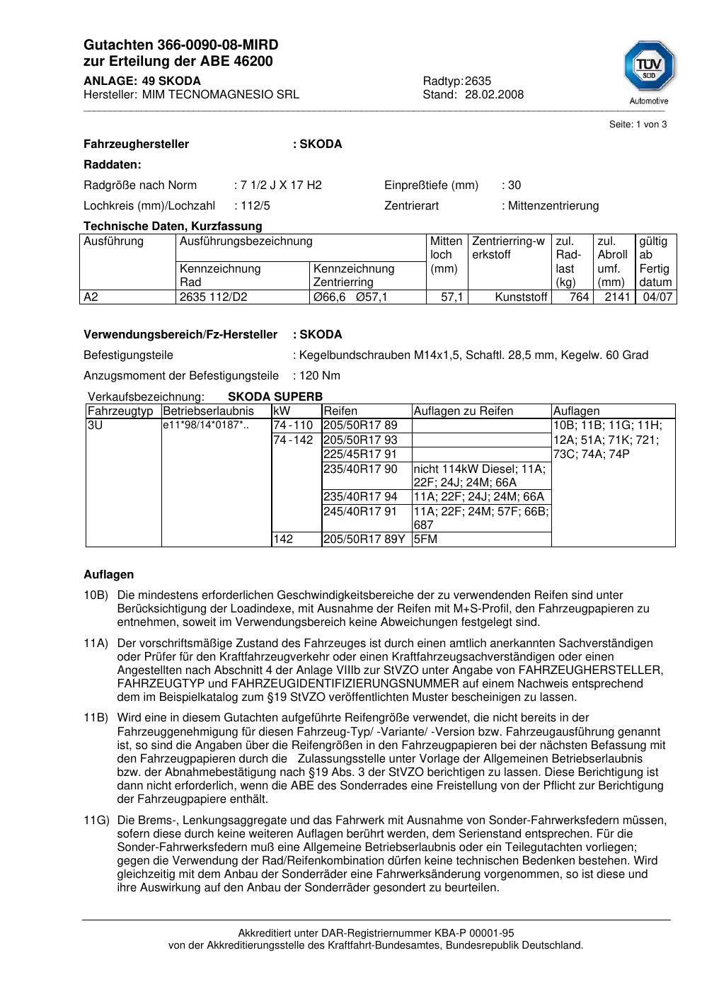 Felgengutachten / abe für Alufelgen ATS 2635 (2Jx17 ET 0, Mittenloch 0 mm) mit KBA 46200 (Zertifikatsnummer 46200). Hier kostenlos als PDF herunterladen. Der Download-Link ist 24 Stunden gültig und kann bis zu zwei Mal verwendet werden.