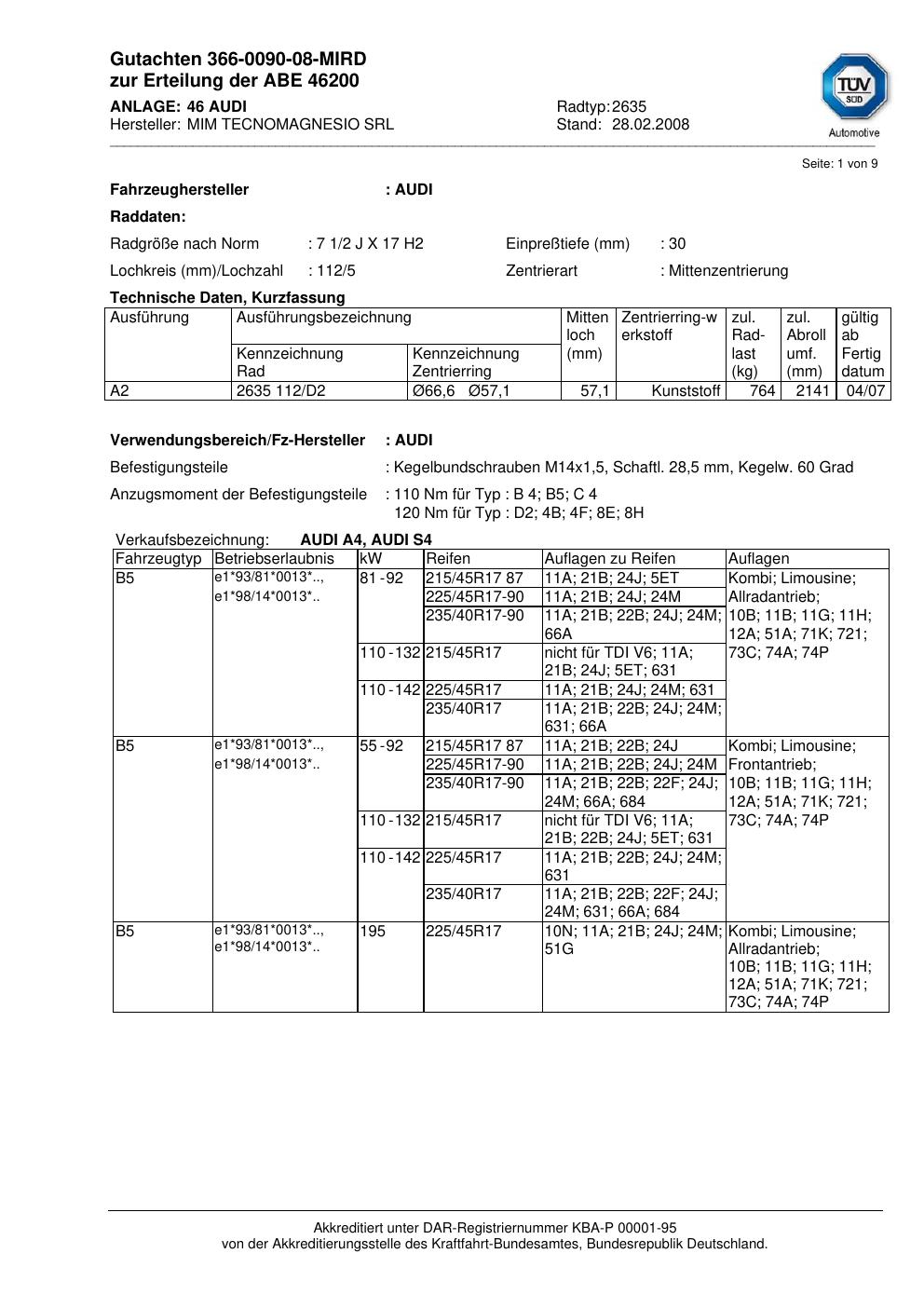 Felgengutachten / abe für Alufelgen ATS 2635 (2Jx17 ET 0, Mittenloch 0 mm) mit KBA 46200 (Zertifikatsnummer 46200). Hier kostenlos als PDF herunterladen. Der Download-Link ist 24 Stunden gültig und kann bis zu zwei Mal verwendet werden.
