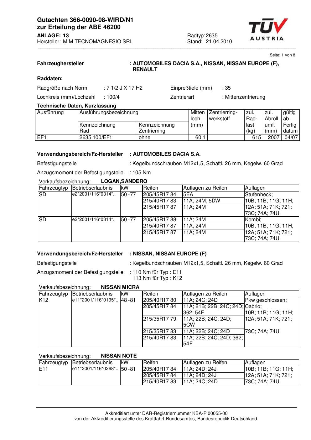 Felgengutachten / abe für Alufelgen ATS 2635 (2Jx17 ET 0, Mittenloch 0 mm) mit KBA 46200 (Zertifikatsnummer 46200). Hier kostenlos als PDF herunterladen. Der Download-Link ist 24 Stunden gültig und kann bis zu zwei Mal verwendet werden.