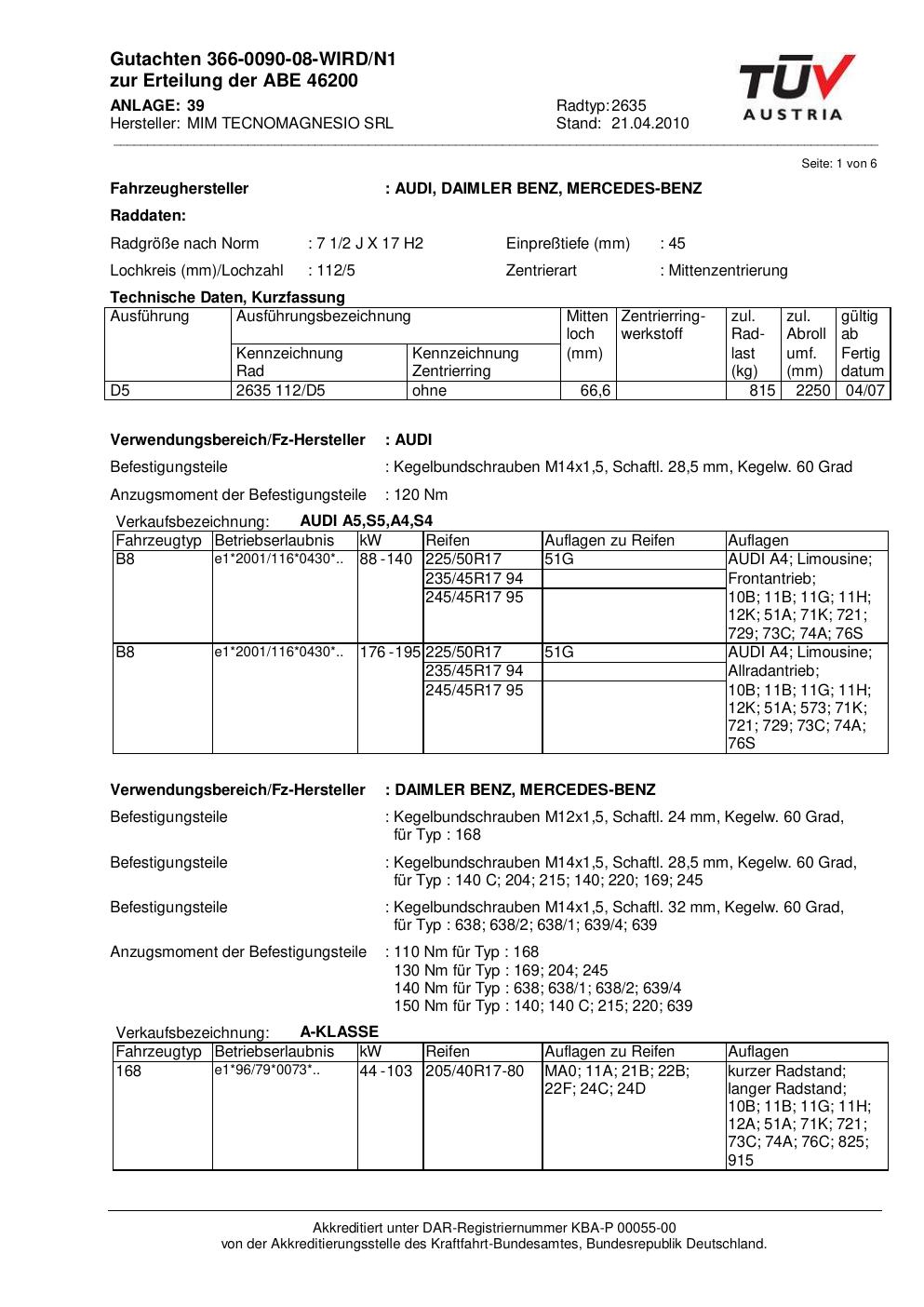 Felgengutachten / abe für Alufelgen ATS 2635 (2Jx17 ET 0, Mittenloch 0 mm) mit KBA 46200 (Zertifikatsnummer 46200). Hier kostenlos als PDF herunterladen. Der Download-Link ist 24 Stunden gültig und kann bis zu zwei Mal verwendet werden.