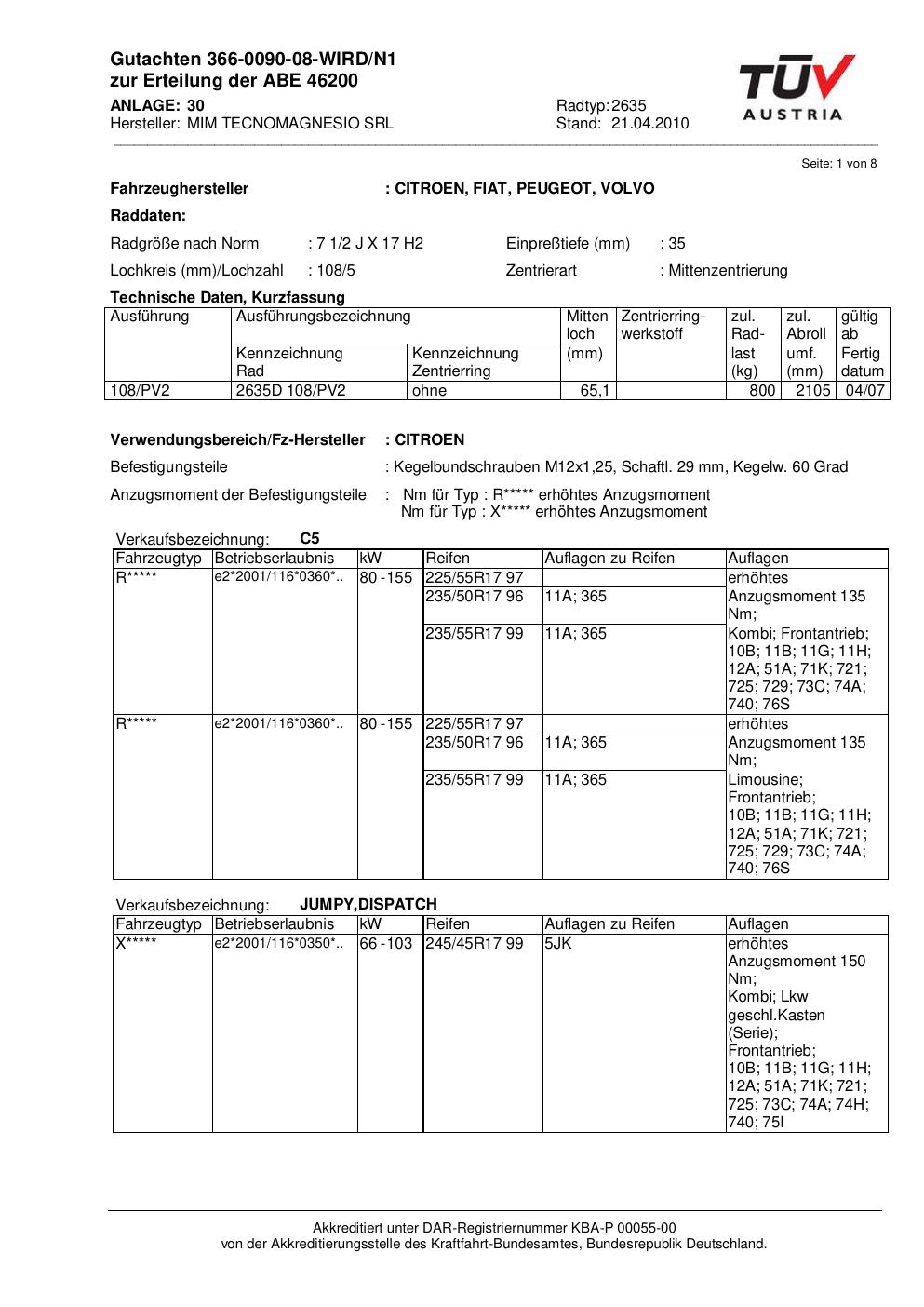 Felgengutachten / abe für Alufelgen ATS 2635 (2Jx17 ET 0, Mittenloch 0 mm) mit KBA 46200 (Zertifikatsnummer 46200). Hier kostenlos als PDF herunterladen. Der Download-Link ist 24 Stunden gültig und kann bis zu zwei Mal verwendet werden.