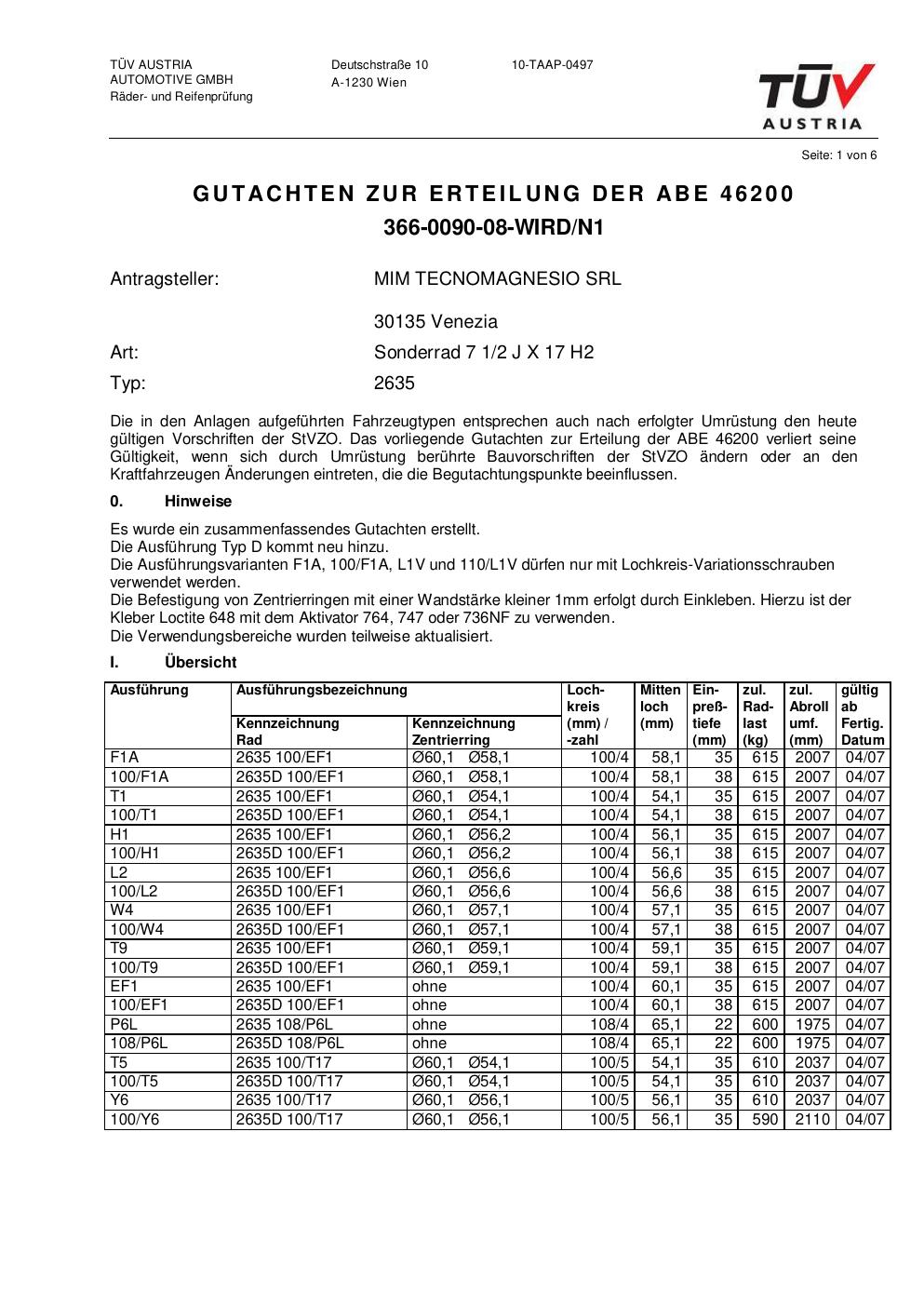 Felgengutachten / abe für Alufelgen ATS 2635 (2Jx17 ET 0, Mittenloch 0 mm) mit KBA 46200 (Zertifikatsnummer 46200). Hier kostenlos als PDF herunterladen. Der Download-Link ist 24 Stunden gültig und kann bis zu zwei Mal verwendet werden.