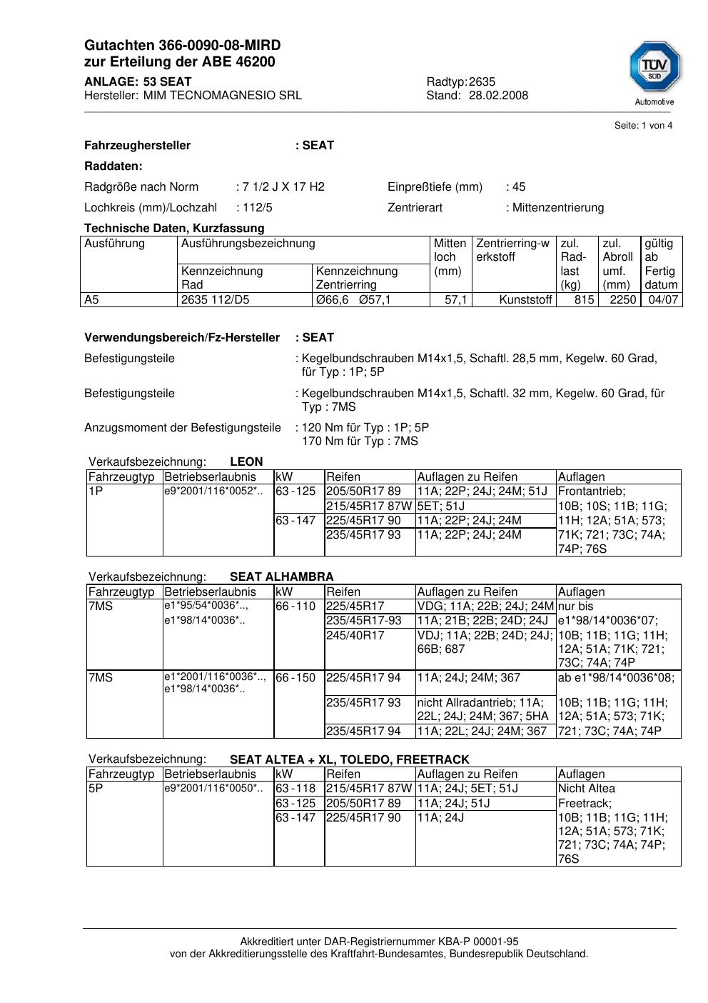 Felgengutachten / abe für Alufelgen ATS 2635 (2Jx17 ET 0, Mittenloch 0 mm) mit KBA 46200 (Zertifikatsnummer 46200). Hier kostenlos als PDF herunterladen. Der Download-Link ist 24 Stunden gültig und kann bis zu zwei Mal verwendet werden.