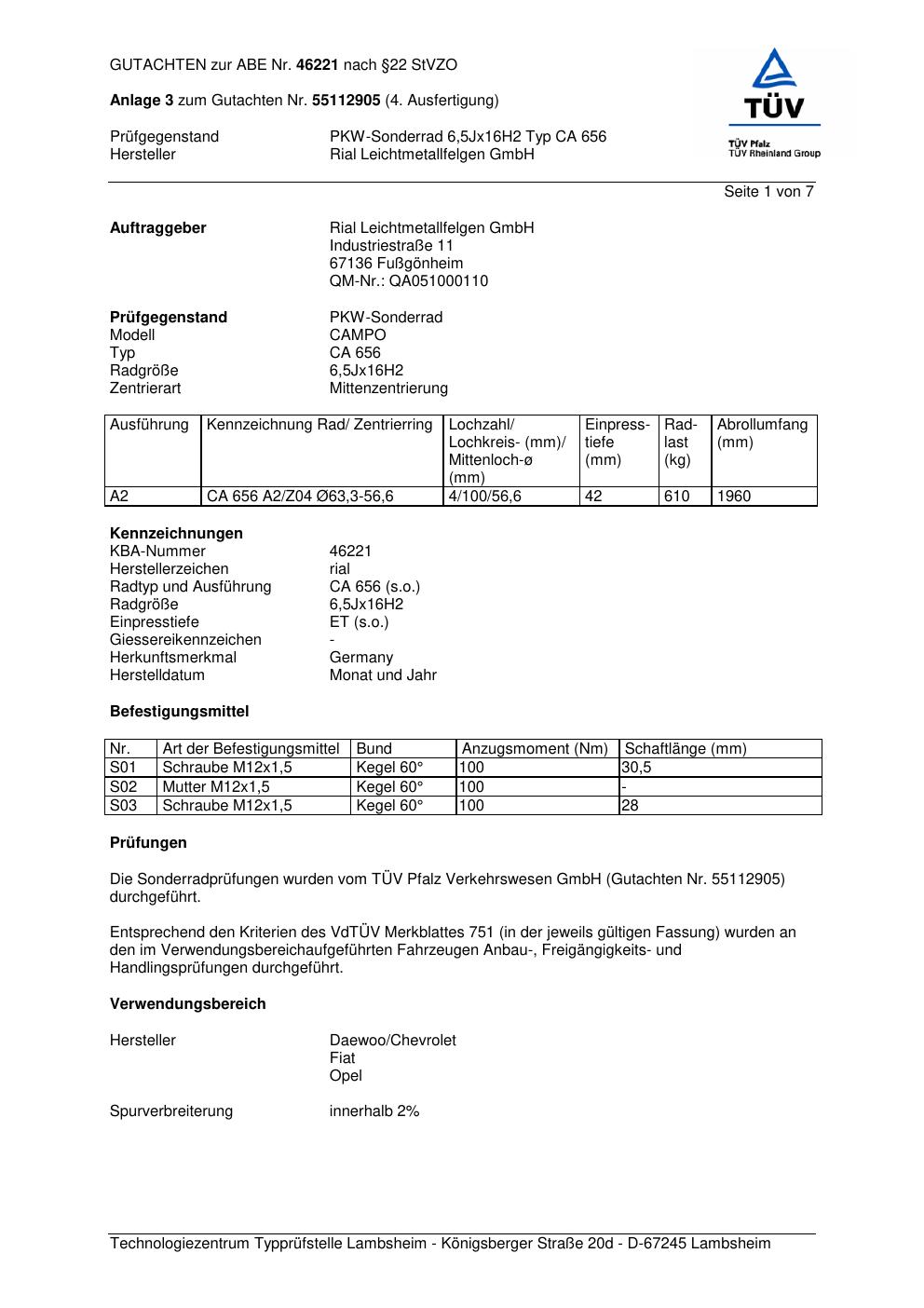 Dieses Gutachten (abe) bezieht sich auf die Alufelge brand-rial CA 656 in der Ausführung 6.5Jx16 ET 0, Mittenloch 0 mm (KBA 46221). Im PDF findest du typischerweise zulässige Reifengrößen, Auflagen/Anbauhinweise und – je nach Dokument – Hinweise zur Eintragung.