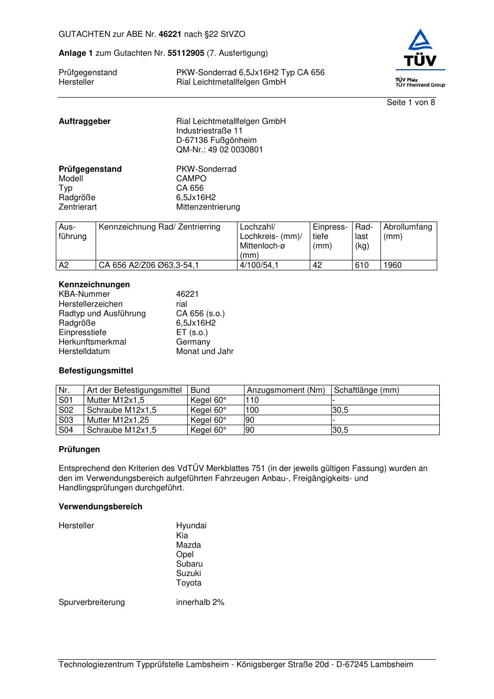 Dieses Gutachten (abe) bezieht sich auf die Alufelge brand-rial CA 656 in der Ausführung 6.5Jx16 ET 0, Mittenloch 0 mm (KBA 46221). Im PDF findest du typischerweise zulässige Reifengrößen, Auflagen/Anbauhinweise und – je nach Dokument – Hinweise zur Eintragung.