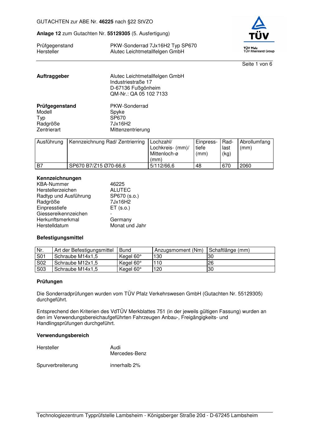 Dieses Gutachten (abe) bezieht sich auf die Alufelge ALUTEC SP670 in der Ausführung 7Jx16 ET 0, Mittenloch 0 mm (KBA 46225). Im PDF findest du typischerweise zulässige Reifengrößen, Auflagen/Anbauhinweise und – je nach Dokument – Hinweise zur Eintragung.