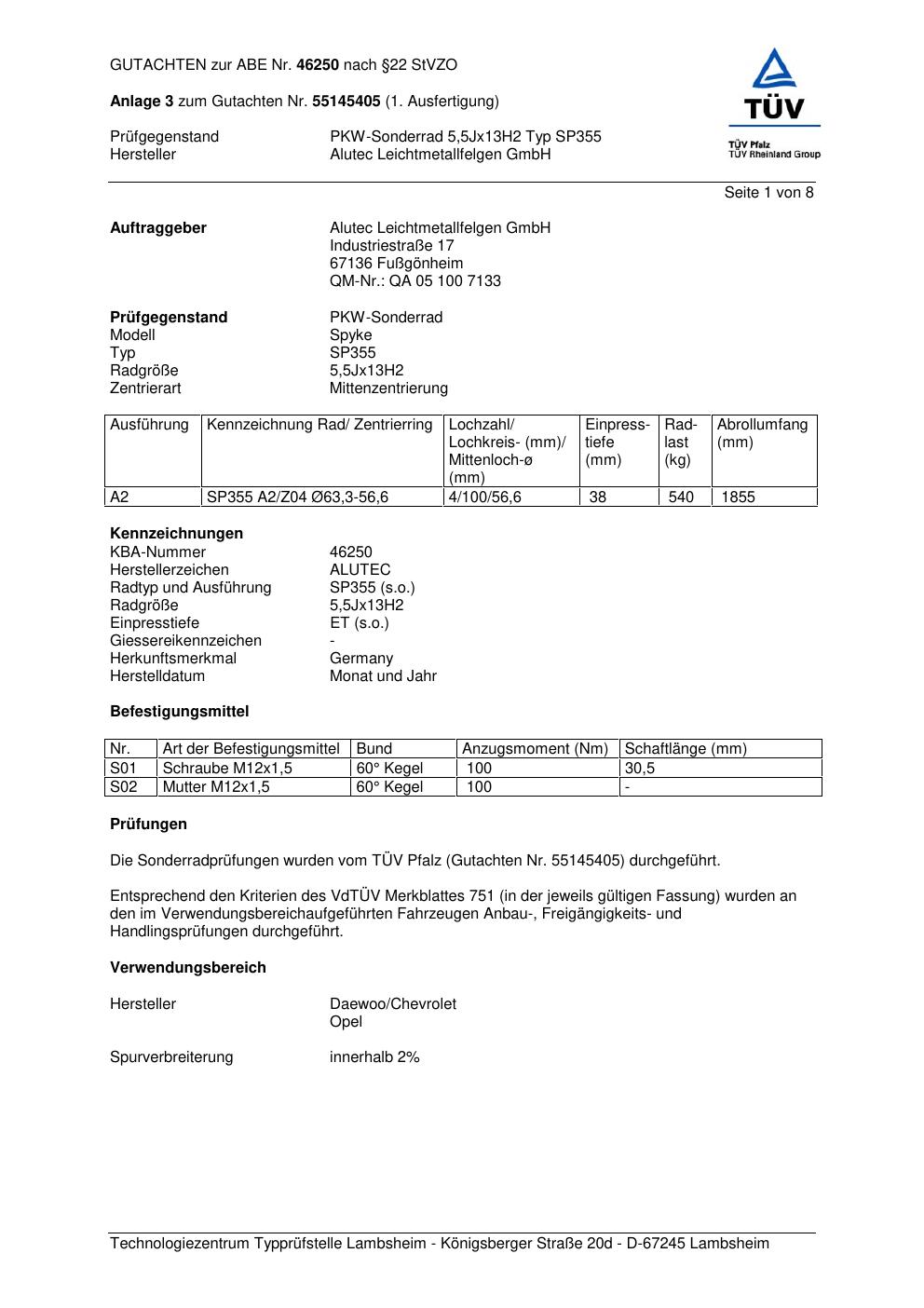 Dieses Gutachten (abe) bezieht sich auf die Alufelge ALUTEC SP355 Hersteller Alutec Leichtmetallfelge in der Ausführung 5.5Jx13 ET 0, Mittenloch 0 mm (KBA 46250). Im PDF findest du typischerweise zulässige Reifengrößen, Auflagen/Anbauhinweise und – je nach Dokument – Hinweise zur Eintragung.