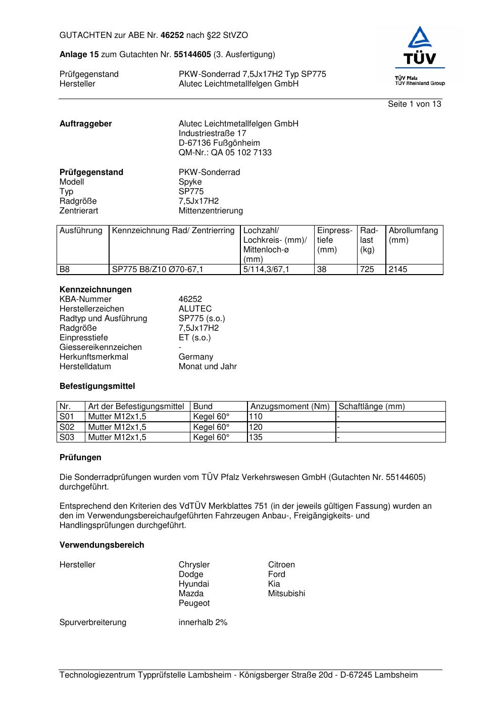 Dieses Gutachten (abe) bezieht sich auf die Alufelge ALUTEC SP775 in der Ausführung 7.5Jx17 ET 0, Mittenloch 0 mm (KBA 46252). Im PDF findest du typischerweise zulässige Reifengrößen, Auflagen/Anbauhinweise und – je nach Dokument – Hinweise zur Eintragung.