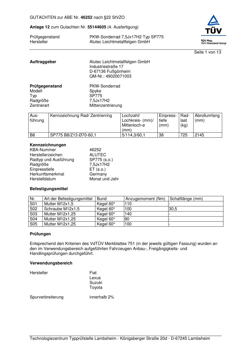 Dieses Gutachten (abe) bezieht sich auf die Alufelge ALUTEC SP775 in der Ausführung 7.5Jx17 ET 0, Mittenloch 0 mm (KBA 46252). Im PDF findest du typischerweise zulässige Reifengrößen, Auflagen/Anbauhinweise und – je nach Dokument – Hinweise zur Eintragung.