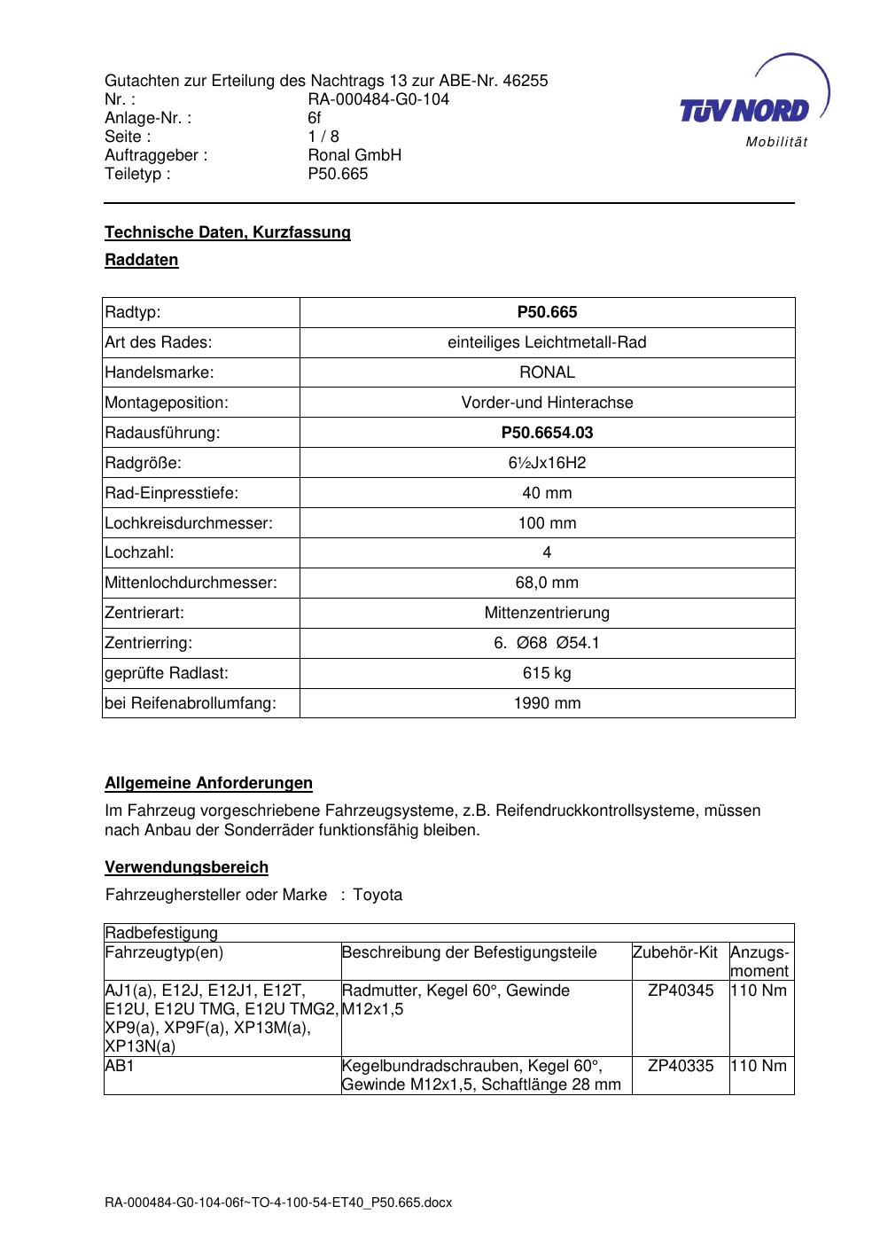 Dieses Gutachten (abe) bezieht sich auf die Alufelge ATS P50.665 in der Ausführung ET 0, Mittenloch 0 mm (KBA 46255). Im PDF findest du typischerweise zulässige Reifengrößen, Auflagen/Anbauhinweise und – je nach Dokument – Hinweise zur Eintragung.