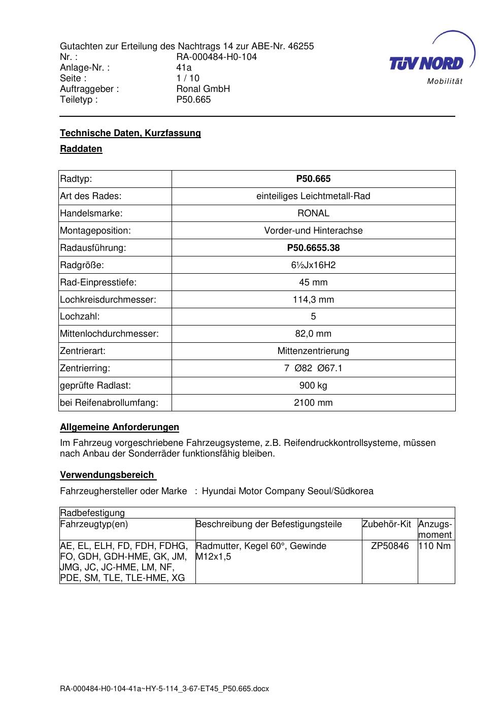 Dieses Gutachten (abe) bezieht sich auf die Alufelge Ronal P50.665 in der Ausführung ET 0, Mittenloch 0 mm (KBA 46255). Im PDF findest du typischerweise zulässige Reifengrößen, Auflagen/Anbauhinweise und – je nach Dokument – Hinweise zur Eintragung.