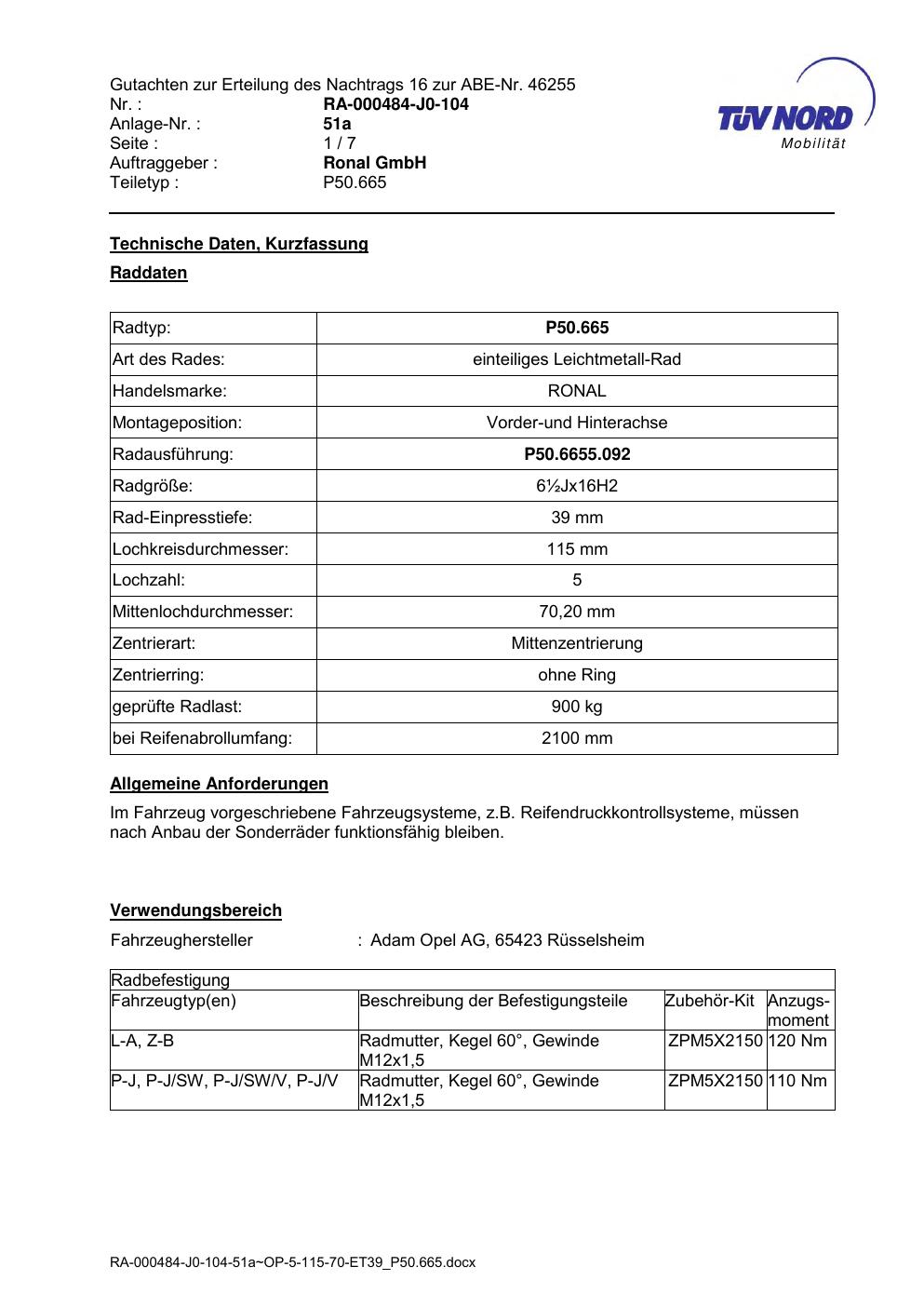 Dieses Gutachten (abe) bezieht sich auf die Alufelge Ronal P50.665 in der Ausführung ET 0, Mittenloch 0 mm (KBA 46255). Im PDF findest du typischerweise zulässige Reifengrößen, Auflagen/Anbauhinweise und – je nach Dokument – Hinweise zur Eintragung.