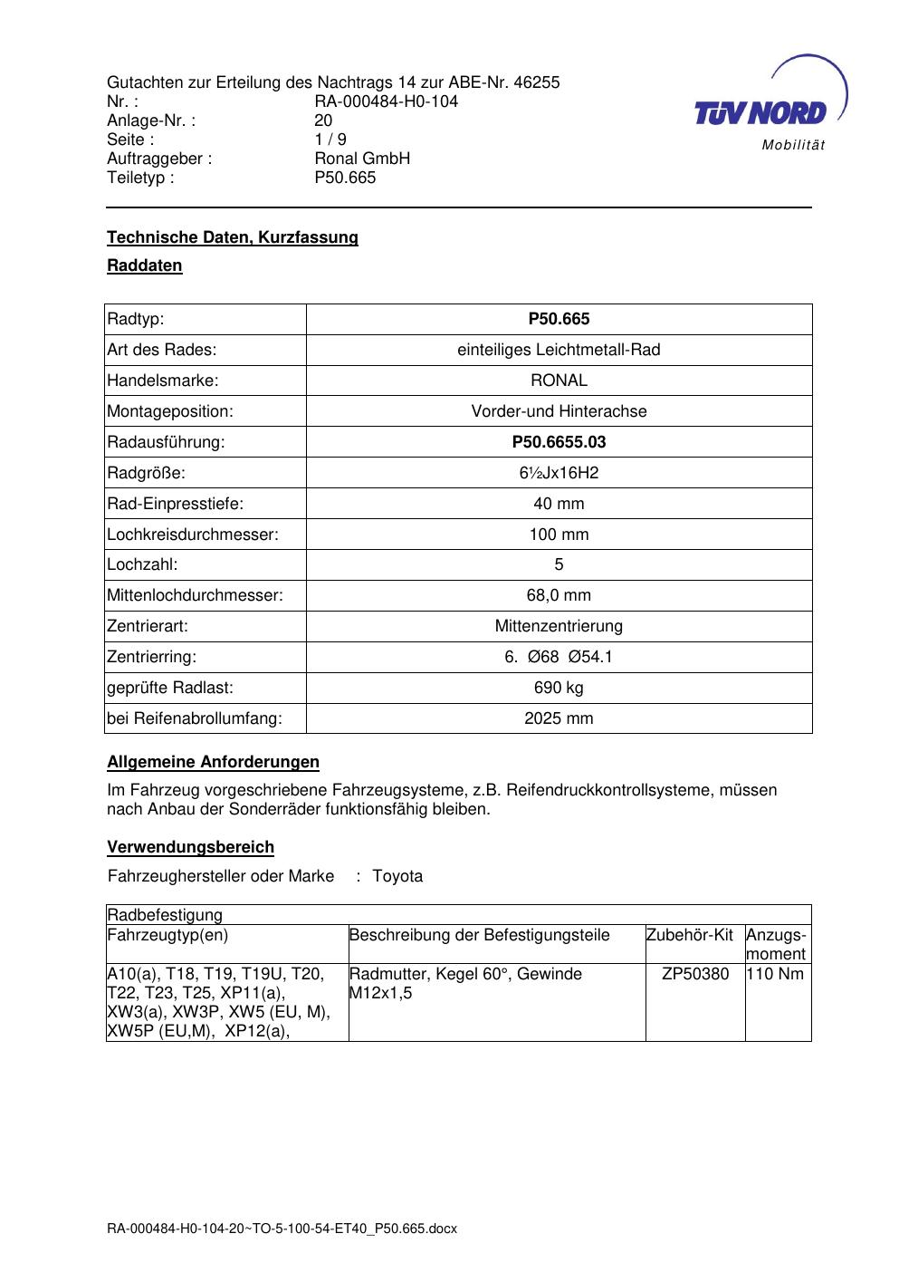 Dieses Gutachten (abe) bezieht sich auf die Alufelge Ronal P50.665 in der Ausführung ET 0, Mittenloch 0 mm (KBA 46255). Im PDF findest du typischerweise zulässige Reifengrößen, Auflagen/Anbauhinweise und – je nach Dokument – Hinweise zur Eintragung.