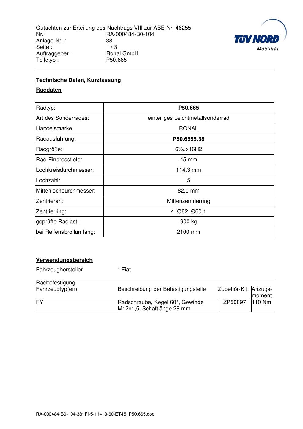 Dieses Gutachten (abe) bezieht sich auf die Alufelge Ronal P50.665 in der Ausführung ET 0, Mittenloch 0 mm (KBA 46255). Im PDF findest du typischerweise zulässige Reifengrößen, Auflagen/Anbauhinweise und – je nach Dokument – Hinweise zur Eintragung.