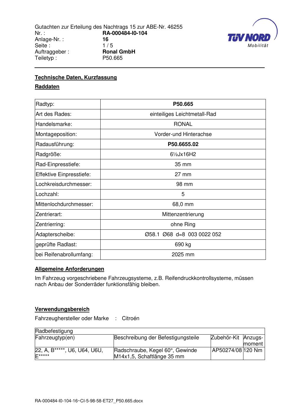 Dieses Gutachten (abe) bezieht sich auf die Alufelge Ronal P50.665 in der Ausführung ET 0, Mittenloch 0 mm (KBA 46255). Im PDF findest du typischerweise zulässige Reifengrößen, Auflagen/Anbauhinweise und – je nach Dokument – Hinweise zur Eintragung.