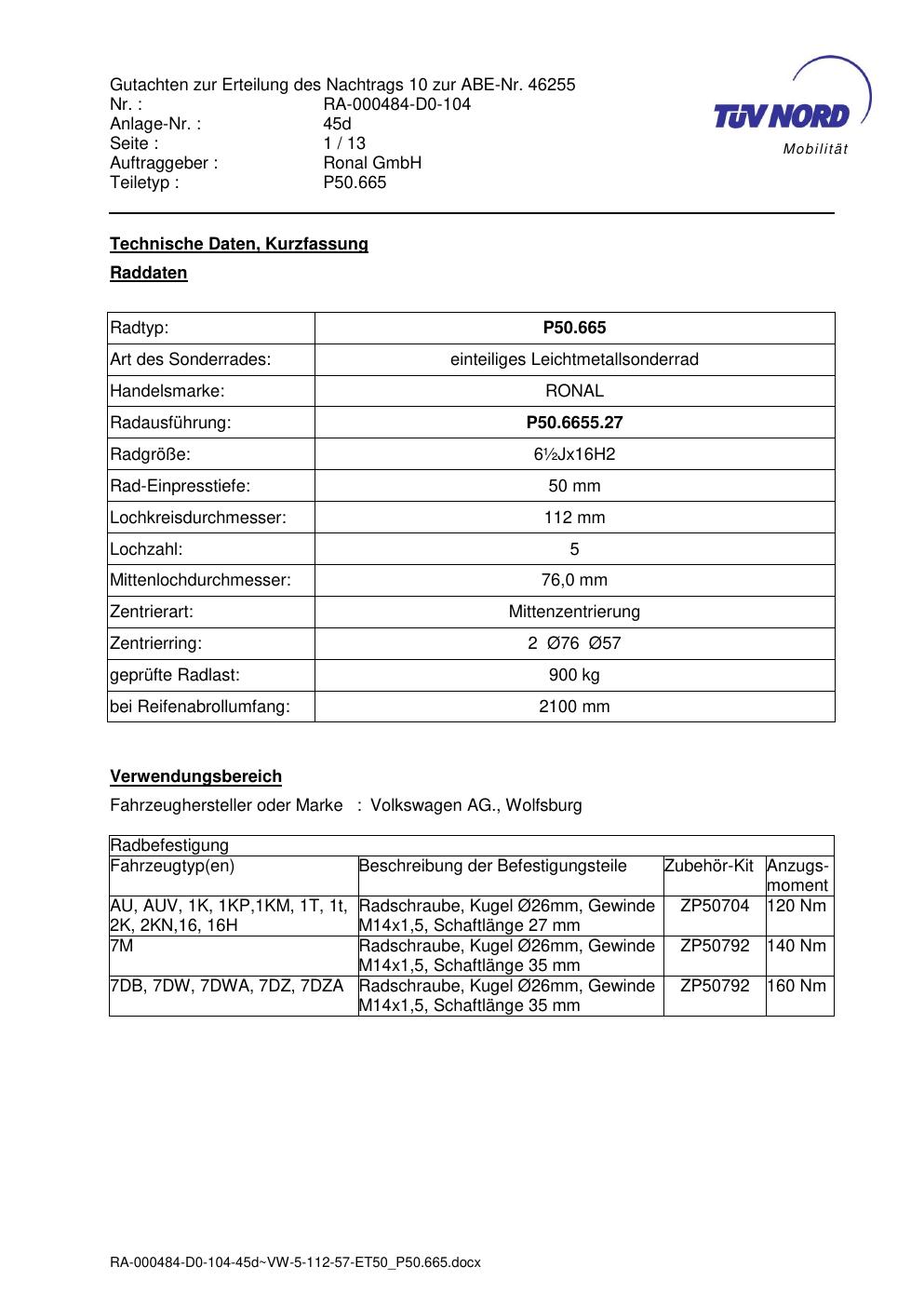 Dieses Gutachten (abe) bezieht sich auf die Alufelge Ronal P50.665 in der Ausführung ET 0, Mittenloch 0 mm (KBA 46255). Im PDF findest du typischerweise zulässige Reifengrößen, Auflagen/Anbauhinweise und – je nach Dokument – Hinweise zur Eintragung.