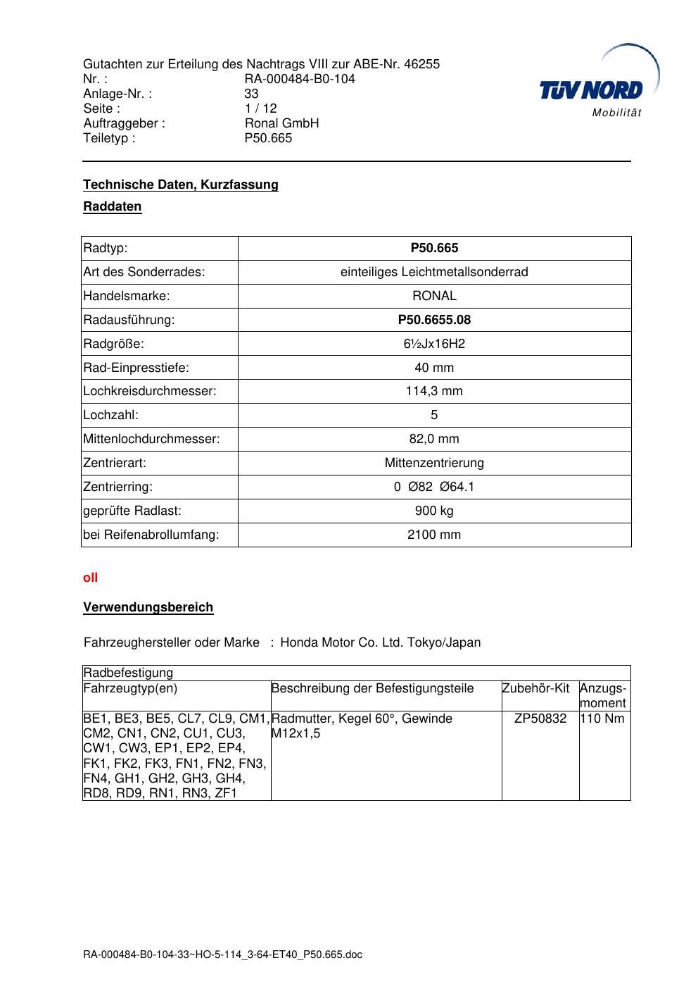 • Stimmt die KBA-Nummer auf der Felge mit diesem Dokument überein?