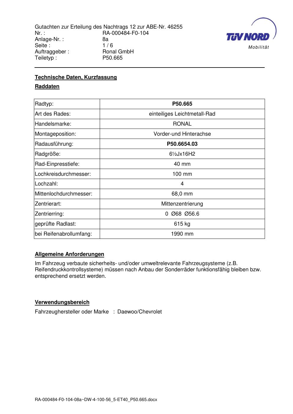 Dieses Gutachten (abe) bezieht sich auf die Alufelge Ronal P50.665 in der Ausführung ET 0, Mittenloch 0 mm (KBA 46255). Im PDF findest du typischerweise zulässige Reifengrößen, Auflagen/Anbauhinweise und – je nach Dokument – Hinweise zur Eintragung.